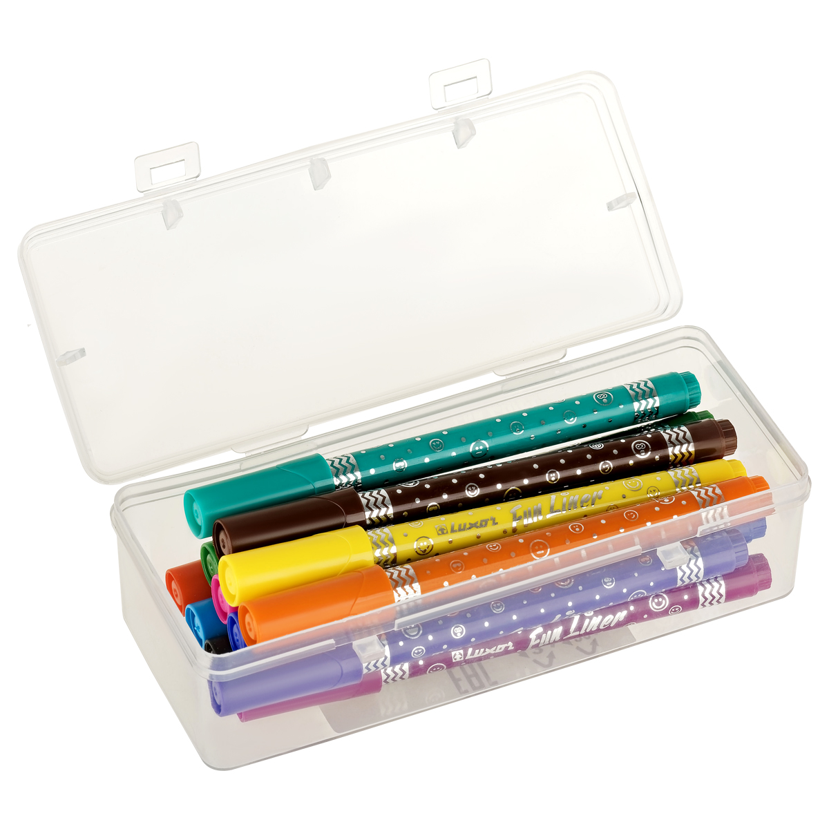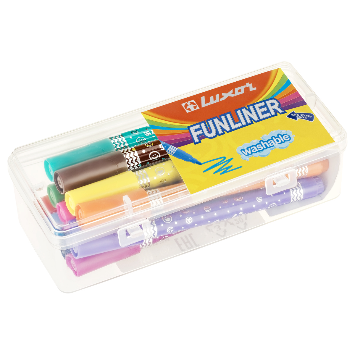 Набор фломастеров Luxor Fun Liner – идеальный инструмент для творчества, подойдет детям и взрослым. В наборе 12 фломастеров: черный, красный, синий, зеленый, морской-зеленый, желтый, оранжевый, коричневый, голубой, фиолетовый, розовый, фуксия. Упакованы в прозрачный плотный пластиковый пенал, в котором их удобно хранить.<br/>Фломастеры предназначены специально для детей от 3 лет. Они имеют круглую форму корпуса с забавным рисунком и специальное строение пишущего узла, который при сильном нажатии не деформируется и не вдавливается. Чернила на водной основе легко отстирываются с одежды и смываются с рук водой. Фломастеры Luxor представлены с безопасным вентилируемым колпачком, который легко снимается и надевается. <br/>• Количество цветов: 12;<br/>• Водная основа: безопасна для детей;<br/>• Особенности: для детей от 3-х лет;<br/>• Особенности: смываемые