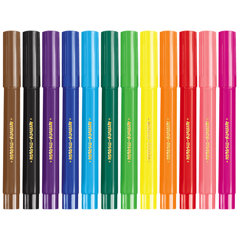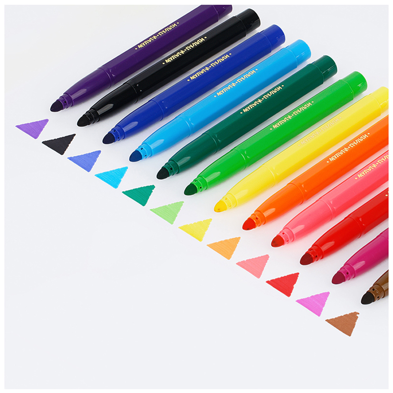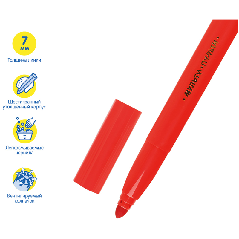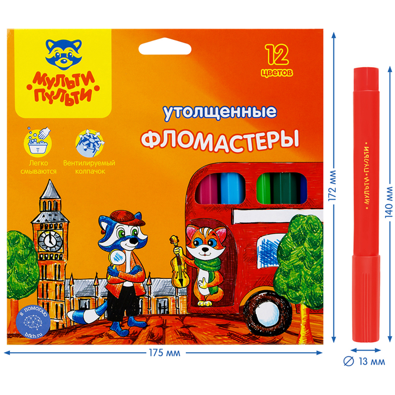 Фломастеры «Мульти-Пульти» серии «Енот в Англии» представлены со смываемыми чернилами, вентилируемым колпачком и широким наконечником. Длина письма – 400 метров.Толщина линии письма составляет 7 мм. В наборе 12 ярких цветов: тёмно-розовый, красный, светло-розовый, оранжевый, жёлтый, светло-зелёный, тёмно-зелёный, голубой, синий, фиолетовый, чёрный, коричневый. Утолщённый корпус шестигранной формы имеет удобную зону захвата. Тип наконечника – конический. Наиболее удобны для детей дошкольного возраста. Смываемые чернила на водной основе нетоксичны. Набор фломастеров упакован в картонную коробку с европодвесом.