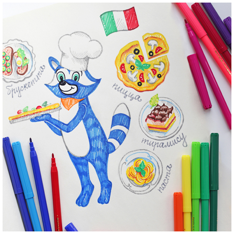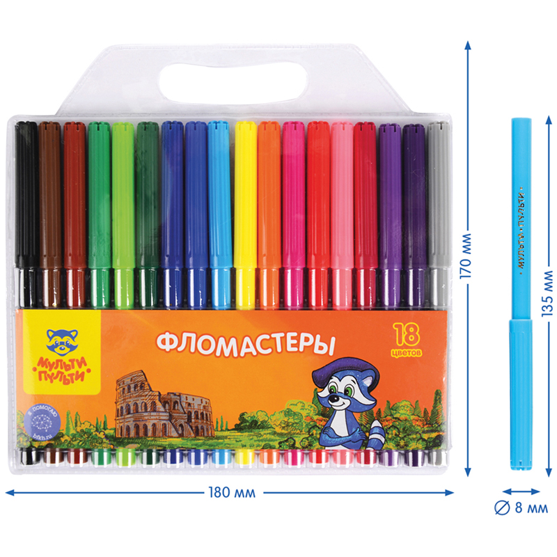 Фломастеры «Мульти-Пульти» серии «Енот в Италии» представлены с легкосмываемыми чернилами и вентилируемым колпачком. Конический тип наконечника имеет толщину линии 2 мм. Длина письма составляет не менее 500 метров. В наборе 18 цветов фломастеров. Корпус круглой формы изготовлен из полипропилена и имеет удобную круглую зону захвата. Фломастеры сохраняют стабильный цвет при письме на протяжении всего использования. Смываемые фломастеры на водной основе нетоксичны. Упакованы в блистер.