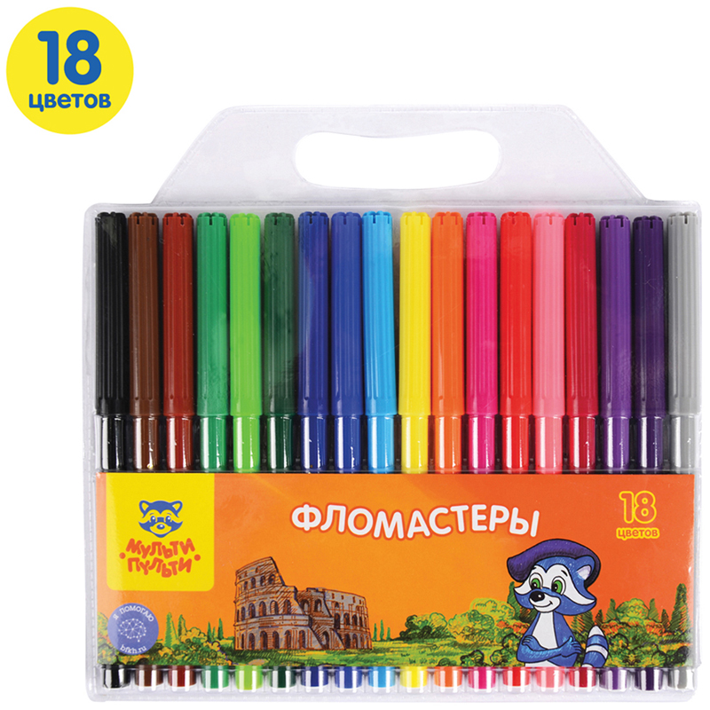 Фломастеры «Мульти-Пульти» серии «Енот в Италии» представлены с легкосмываемыми чернилами и вентилируемым колпачком. Конический тип наконечника имеет толщину линии 2 мм. Длина письма составляет не менее 500 метров. В наборе 18 цветов фломастеров. Корпус круглой формы изготовлен из полипропилена и имеет удобную круглую зону захвата. Фломастеры сохраняют стабильный цвет при письме на протяжении всего использования. Смываемые фломастеры на водной основе нетоксичны. Упакованы в блистер.<br/>• Количество цветов: 18;<br/>• Тип наконечника: конический;<br/>• Длина линии письма: 500 метров.