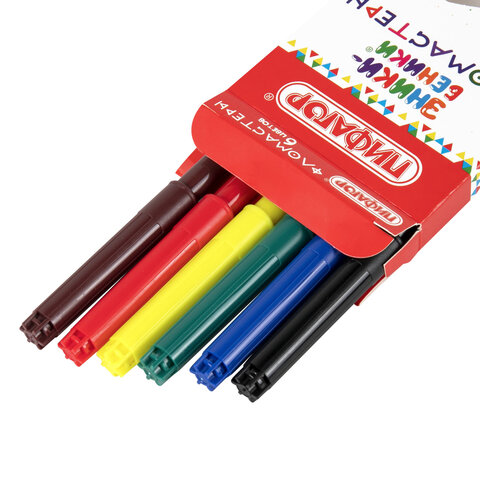 Обладают яркими цветами в количестве 6 штук. Имеют удобную круглую форму корпуса, длина которого 145 мм, а диаметр - 8 мм. Благодаря толщине линии письма 1 мм и диаметру пишущего узла 1,8 мм процесс раскрашивания становится легким. Длина письма составляет 600 м: такого расхода хватит надолго. Фломастеры легко смываются с большинства материалов и кожи. Корпус изготовлен из качественного полипропилена, который значительно продлевает срок службы фломастеров. Колпачок имеет специальные прорези для вентиляции, которые способствуют прохождению воздуха при попадании в дыхательные пути малыша. Рекомендованы для детей от 3-х лет.