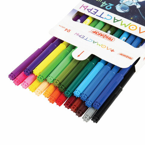 Обладают яркими цветами в количестве 24 штук. Длина корпуса удобной круглой формы составляет 145 мм, а диаметр - 8 мм. Благодаря толщине линии письма 1 мм и диаметру пишущего узла 1,8 мм процесс раскрашивания становится легким.