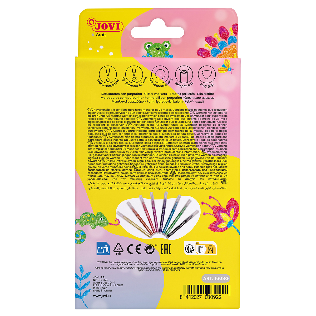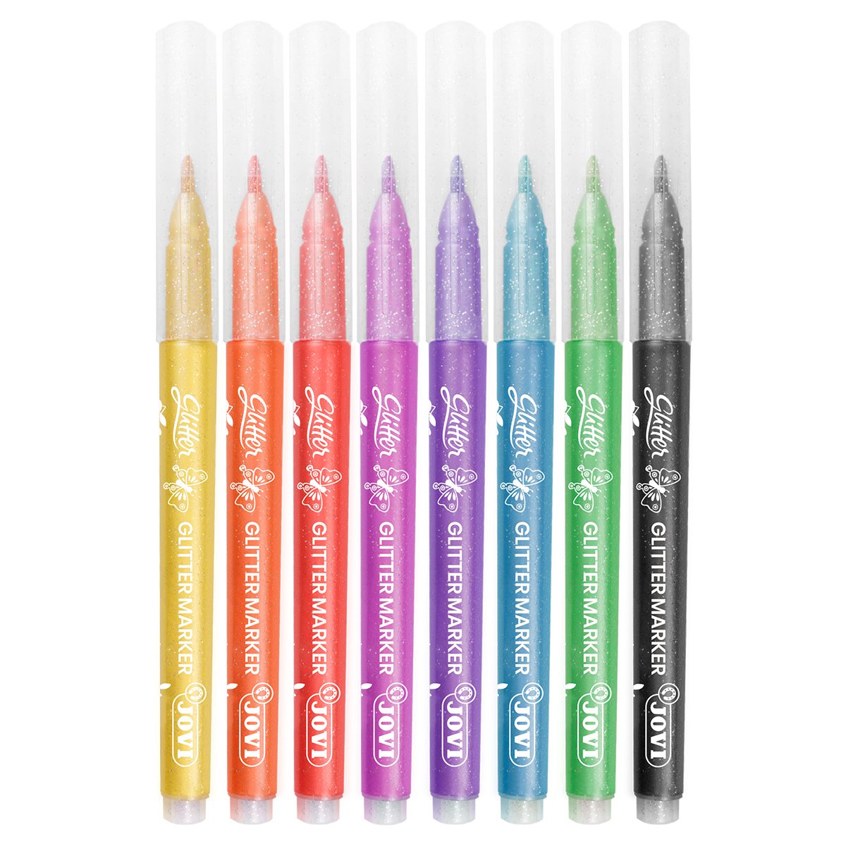 Набор фломастеров JOVI Glitter с блестящими чернилами, с помощью которых можно украсить рисунок и дать волю фантазии. Толщина линии письма - 3 мм, а длина линии письма составляет 400 метров. В наборе 8 фломастеров с блёстками: жёлтый, красный, чёрный, голубой, светло-зелёный, оранжевый, фиолетовый, серый.<br/>Фломастеры представлены с коническим наконечником. Удобная треугольная форма захвата эргономична, тренирует навык правильного захвата и снижает нагрузку на кисти рук. Смываемые чернила на водной основе. Фломастеры JOVI не высыхают без колпачка в течение 96 часов. Специальные вентилируемые колпачки обеспечивают прохождение воздуха при случайном проглатывании. Упакованы в картонную коробку с европодвесом. <br/>• Количество цветов: 08;<br/>• Тип наконечника: конический;<br/>• Длина линии письма: 400 метров
