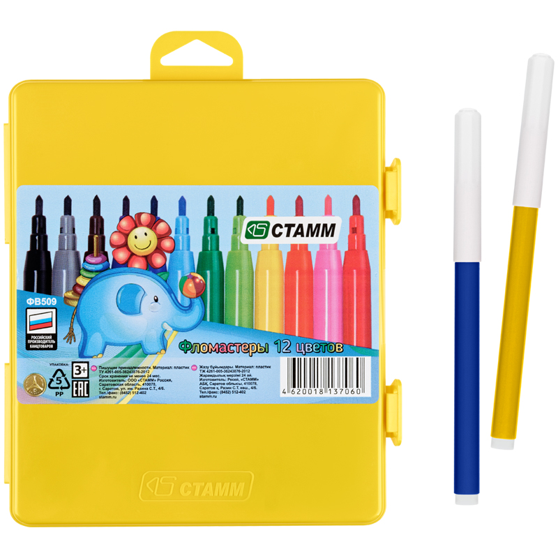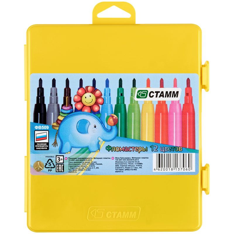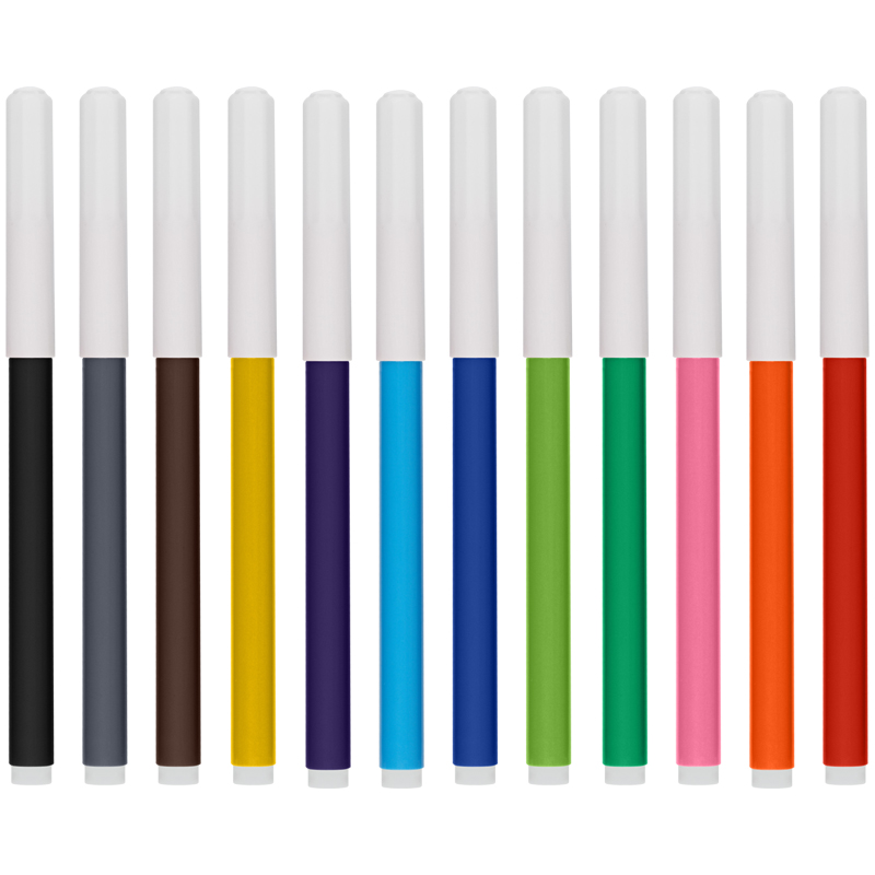 Набор фломастеров 12цв. со смываемыми чернилами. Длина линии письма 400м. Вентилируемый колпачок. Удобная многоразовая упаковка – яркий пенал с двумя защёлками и европодвесом. Пенал долго прослужит и поможет сохранить порядок на рабочем столе.
