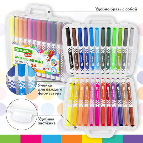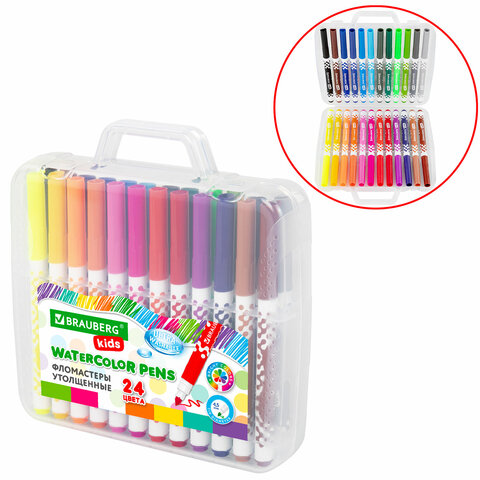Набор из 24 фломастеров в в пластиковом кейсе с удобной ручкой и надежными защелками. Фломастеры изготовлены из пластика, имеют круглую форму. Длина фломастера - 158 мм, диаметр - 11,5 мм. Фломастеры размещены в отдельных ячейках, которые препятствуют их выпадению. Благодаря толщине линии письма 1-3 мм и диаметру пишущего узла 5 мм процесс рисования и раскрашивания становится легким и разнообразным.