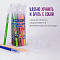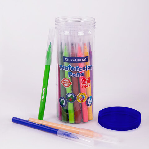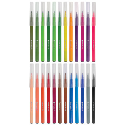 В наборе 24 фломастера, с круглым корпусом из пластика длиной 150 мм и диаметром 8,2 мм. Круглый наконечник из фетра с линией письма 0,5-1 мм удобен для создания тонких линий и прорисовки деталей. Длина письма составляет 350 м: такого расхода хватит надолго. Фломастеры изготовлены на водной основе, поэтому они безопасны и смываются с большинства материалов и кожи. Прозрачный колпачок имеет специальные прорези для вентиляции, которые способствуют прохождению воздуха при попадании в дыхательные пути малыша. Рекомендованы для детей от 3-х лет.