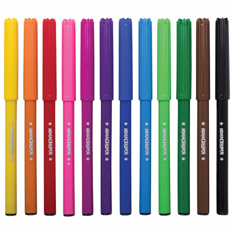 Обладают яркими насыщенными цветами в количестве 12 штук. Удобная круглая форма корпуса, длина которого 139 мм, а диаметр - 8,5 мм. Благодаря толщине линии письма 1 мм и диаметру пишущего узла 2,1 мм процесс раскрашивания становится легким. Длина письма составляет 600 м: такого расхода хватит надолго. Фломастеры изготовлены на водной основе, поэтому они безопасны и легко смываются с большинства материалов и кожи. Наконечник, устойчивый к продавливанию, не проваливается внутрь корпуса и не деформируется даже при сильном нажатии. Полипропиленовый корпус значительно продлевает срок службы фломастеров. Колпачок имеет специальные прорези для вентиляции, которые способствуют прохождению воздуха при попадании в дыхательные пути малыша. Рекомендованы для детей от 3-х лет.