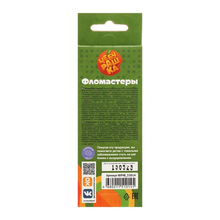 Фломастеры Мульти-Пульти "Чебурашка", 06цв., смываемые, картон, европодвес