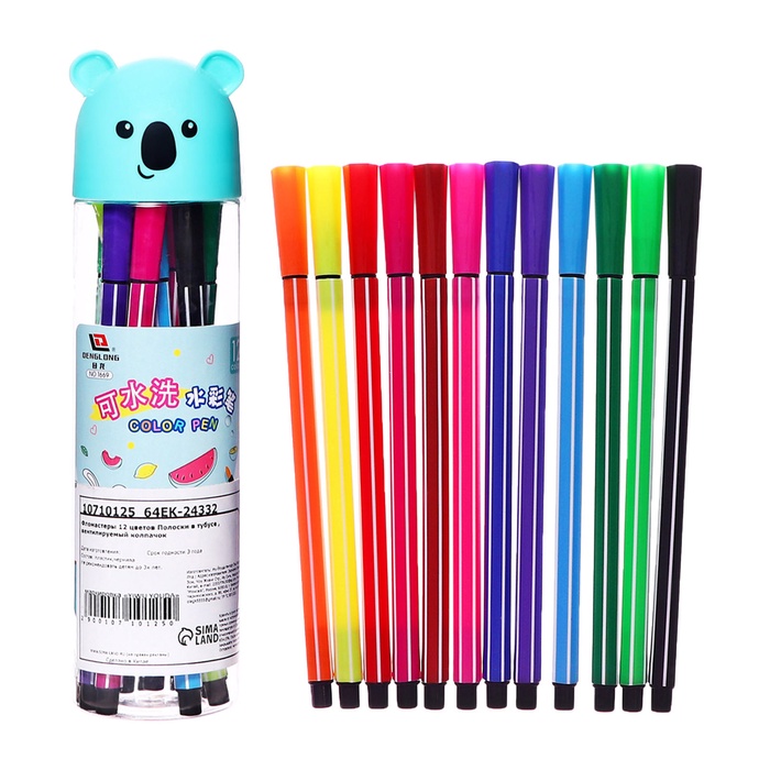 Фломастеры 12 цветов Полоски в тубусе Коала зеленая, вентилируемый колпачок