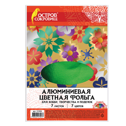 Цветная фольга А4 АЛЮМИНИЕВАЯ НА БУМАЖНОЙ ОСНОВЕ, 7 листов 7 цветов, ОСТРОВ СОКРОВИЩ, 210х297 мм, 111958