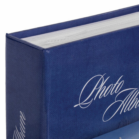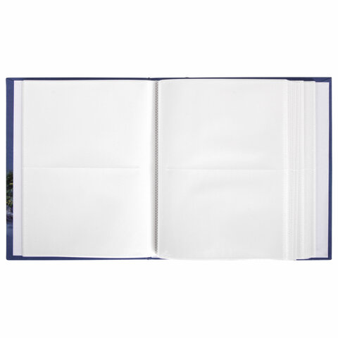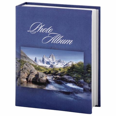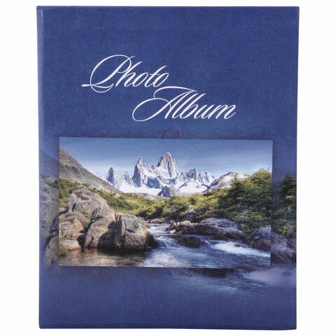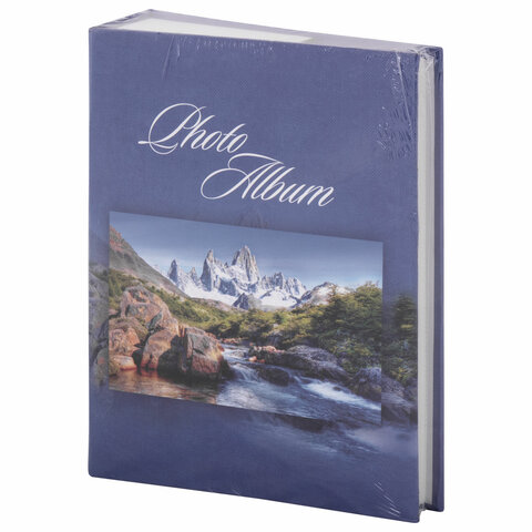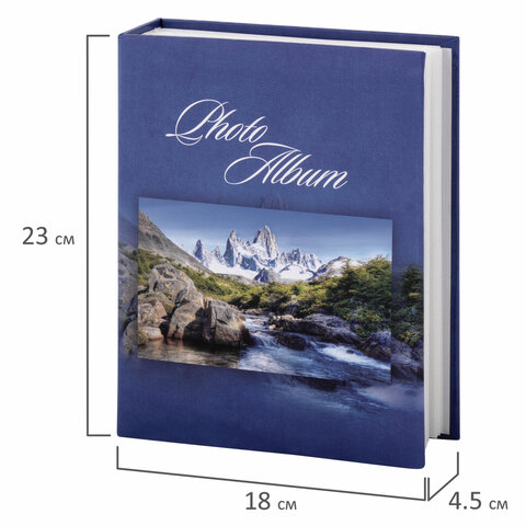 Состоит из 50 полипропиленовых листов размером 17,5х22 см с карманами и вмещает 200 фотографий размером 10х15 см по 2 штуки на странице. На обложке фотоальбома изображен горный пейзаж, а его листы склеены в единый блок. Размер - 18х23 см.