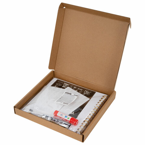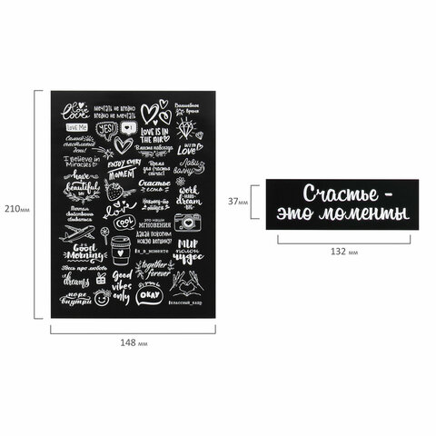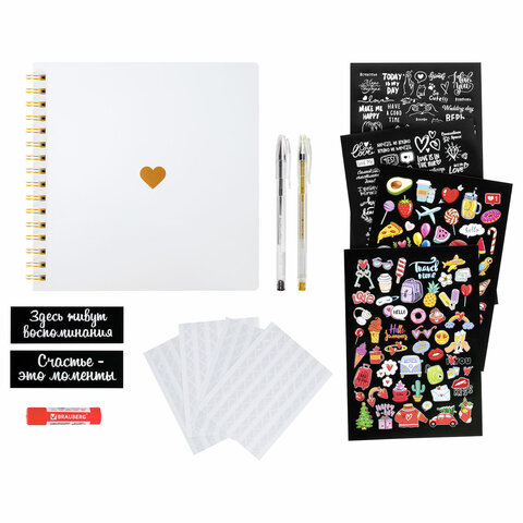 В комплекте с фотоальбомом: 2 крупных надписи (размером 3,7x13,2 см), 2 листа (формата А5) чёрно-белых и 2 листа (формата А5) цветных стикеров, 408 самоклеящихся прозрачных уголков для фото, золотистая и черная гелевые ручки, а также клей-карандаш. Большое количество дополнительных аксессуаров поможет сделать фотоальбом уникальным.
