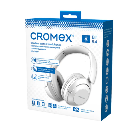 Беспроводные наушники с микрофоном CROMEX HP-043W – незаменимый аксессуар для прослушивания музыки, аудиокниг, лекций и подкастов, а также для телефонных разговоров на прогулке, во время занятия спортом, на отдыхе, за рулем.
