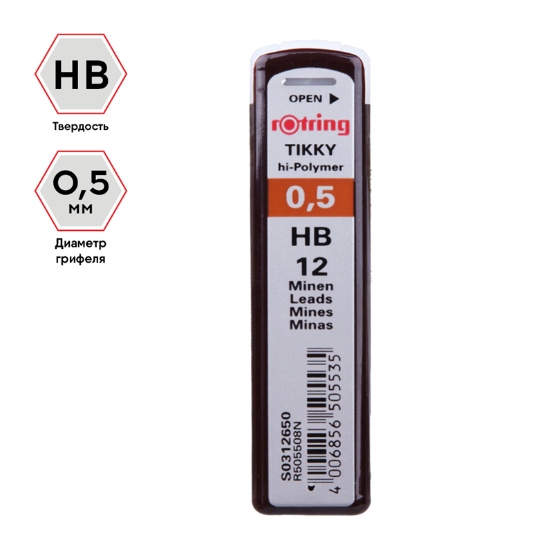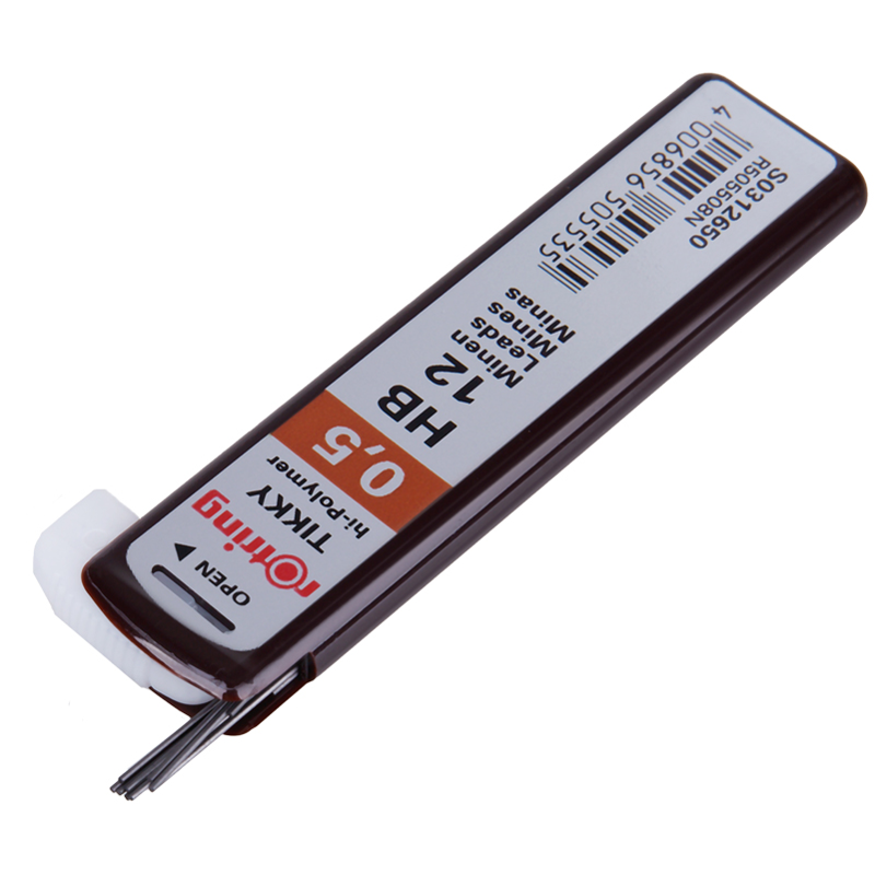 Запасные грифели для механических карандашей Rotring из качественного полимерного материала в удобном пластиковом футляре, препятствующем поломку. Их высокопрочная формула превращает механические карандаши в нечто большее, чем просто карандаш со сменными стержнями. В упаковке представлено 12 шт. Диаметр изделия составляет – 0,5 мм. Товар имеет твёрдость – НB.<br/>• Вид товара: грифели для карандашей;<br/>• Диаметр грифеля: 0,5 мм;<br/>• Твёрдость: НB;<br/>• Количество грифелей в комплекте: 12 шт.;<br/>• Упаковка ед. товара: пластиковый футляр.