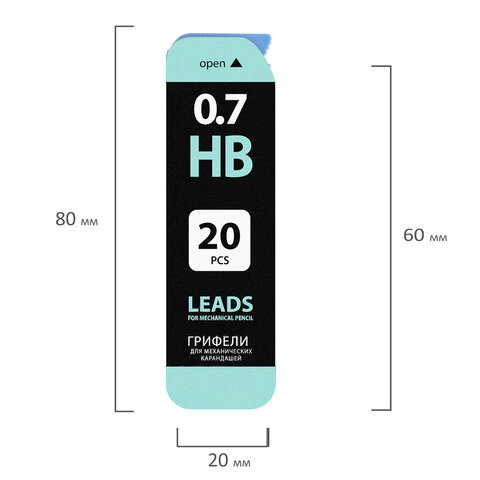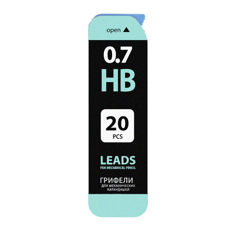 Изготовлены из высококачественных полимерных материалов, обеспечивающих мягкое письмо. Устойчивы к излому. Обладают средней степенью твердости – HB. Длина грифеля составляет 60 мм, а его диаметр - 0,7 мм. 20 штук в упаковке. Поставляются в пластиковом пенале.