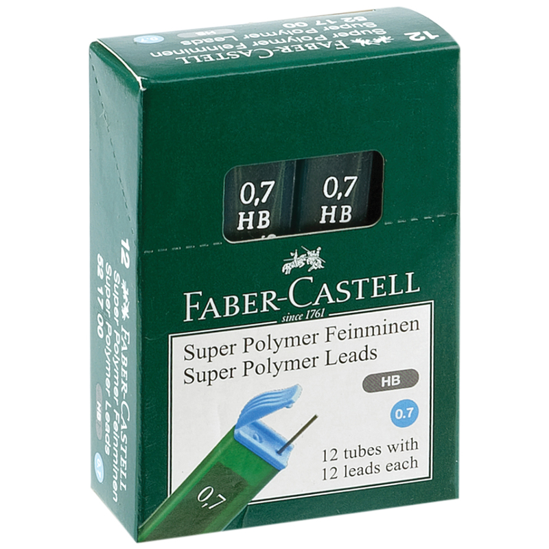 Высококачественные грифели для механических карандашей от немецкого производителя Faber-Castell серии Polymer из качественного полимерного материала в удобном пластиковом футляре, препятствующем поломку, прекрасно подходят как для чертежных, так и для оформительских работ. Товар подходит для любых механических карандашей. В упаковке представлено 12 шт. Диаметр изделия составляет – 0,7 мм, а длина – 60 мм. Товар имеет твёрдость – НB.