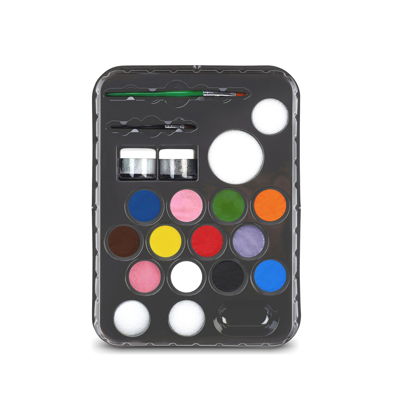 В набор входят: краски (белый и черный - по 2 мл, красный светлый, желтый яркий, травяной зеленый, оранжевый, небесно-голубой, коричневый темный, голубой королевский, бледно-розовый, розовый перламутровый, сиреневый перламутровый - по 1 мл), гель с блестками (серебро, золотая пыль - по 8 мл), 2 кисти, 4 губки.