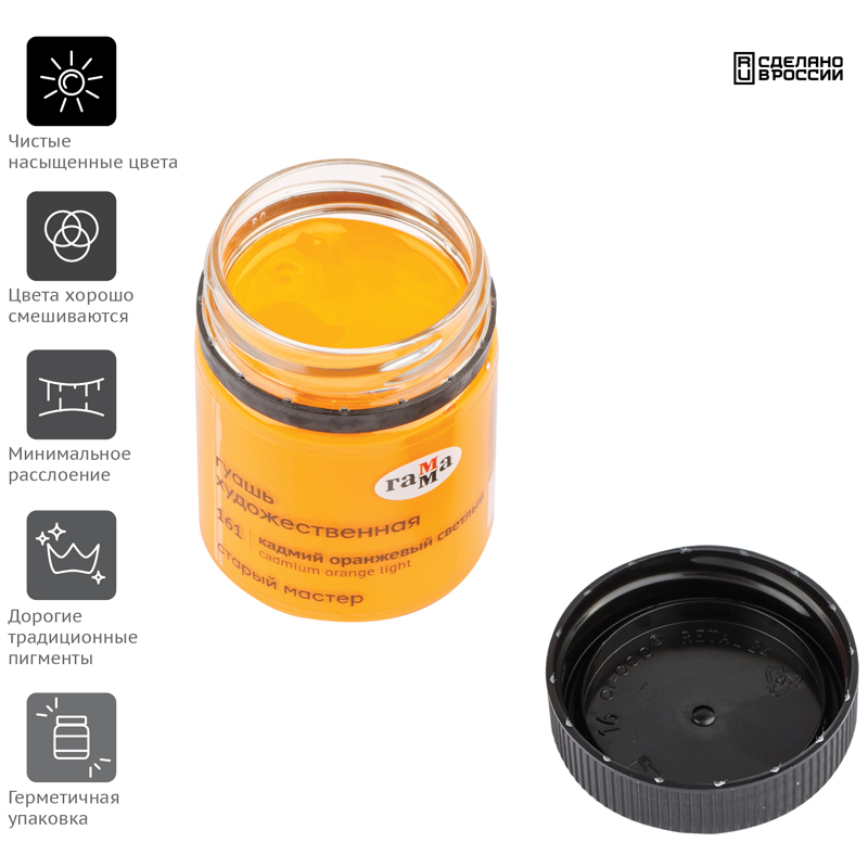 Гуашь художественная "Гамма" серии "Старый мастер" имеет уникальную рецептуру, разработанную в собственной исследовательской лаборатории завода совместно с художниками. Краски изготавливается из тонкодиспесных пигментов, связующего, в состав которого входит раствор растительного клея - гуммиарабика высшей степени очистки. Краска легко наносится на поверхность, благодаря специальным добавкам сохраняет яркость цвета после высыхания, создавая плотный бархатистый слой. Гуашь обладает высокой укрывистостью, отличной разносимостью, а также хорошо смешивается между собой. Большая часть цветов имеет самый высокий показатель светостойкости.