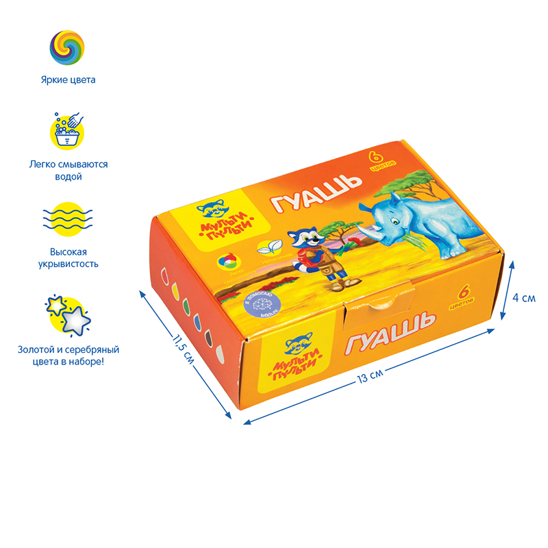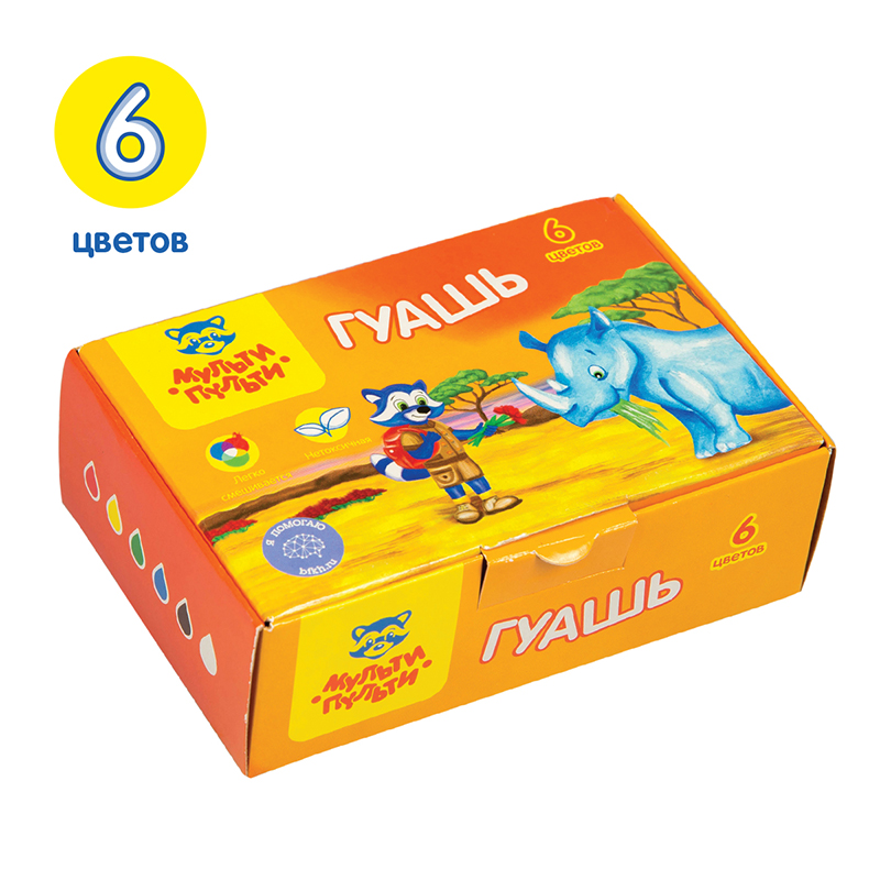 Гуашь "Мульти-Пульти" серии "Енот в Африке" создана специально для детского творчества и декоративно-оформительских работ. Краски подходят для рисования по бумаге, картону, дереву, стеклу, керамике. Для детей старше 3-х лет. В наборе имеются 6 баночек разных цветов (белый, черный, зеленый, синий, желтый, красный). Объём каждой баночки с завинчивающейся крышкой - 20 мл, общий объём - 120 мл. <br/>Гуашь фасуется в пластиковые герметичные баночки с завинчивающейся крышкой. Обладают хорошей кроющей способностью и чистотой цвета.<br/>• Количество цветов: 6;<br/>• Упаковка: пластиковая баночка с завинчивающейся крышкой;<br/>• Объём баночки: 20 мл.