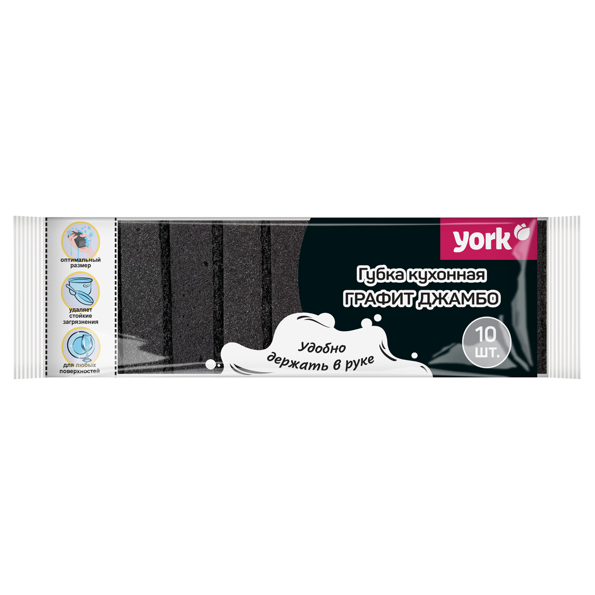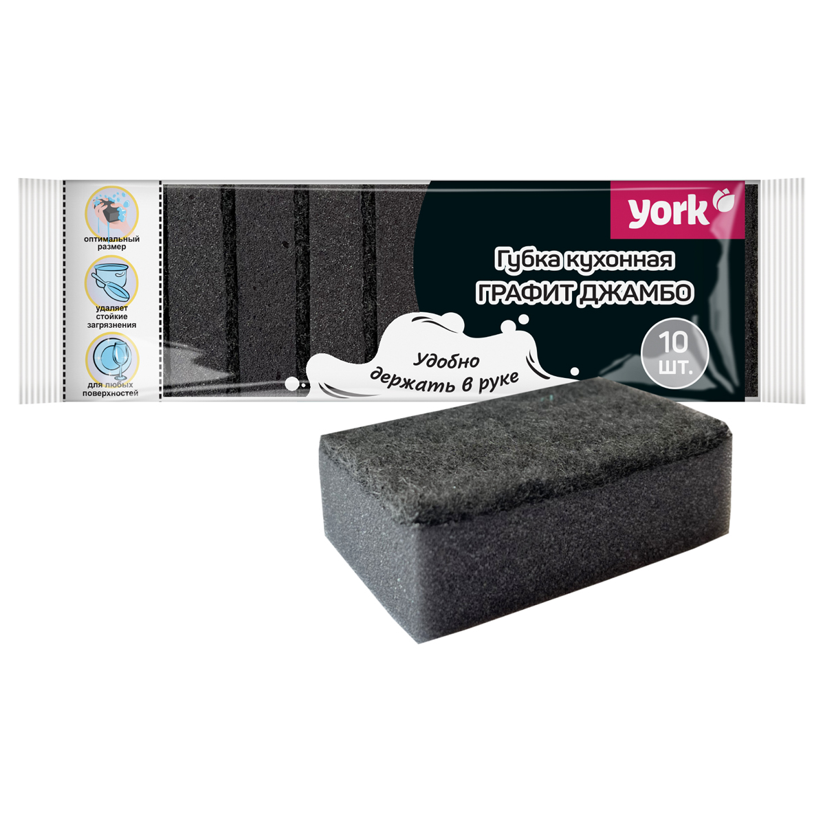 Набор из 10-ти классических двухслойных губок для мытья посуды. Два слоя: мягкий – хорошо справляется с загрязнениями и не царапает посуду; абразивный – позволяет удалять стойкую и присохшую грязь. Оптимальный размер - удобно держать в руке. Прочная и долговечная благодаря высокой плотности поролона и фибры. Трендовый графитовый цвет – стильное и универсальное решение, впишется в любой современный интерьер. Размеры одной губки: 8,5 х 6 х 2,5 см. Состав: пенополиуретан, абразивный материал. Плотность: поролон 18кг/м3,