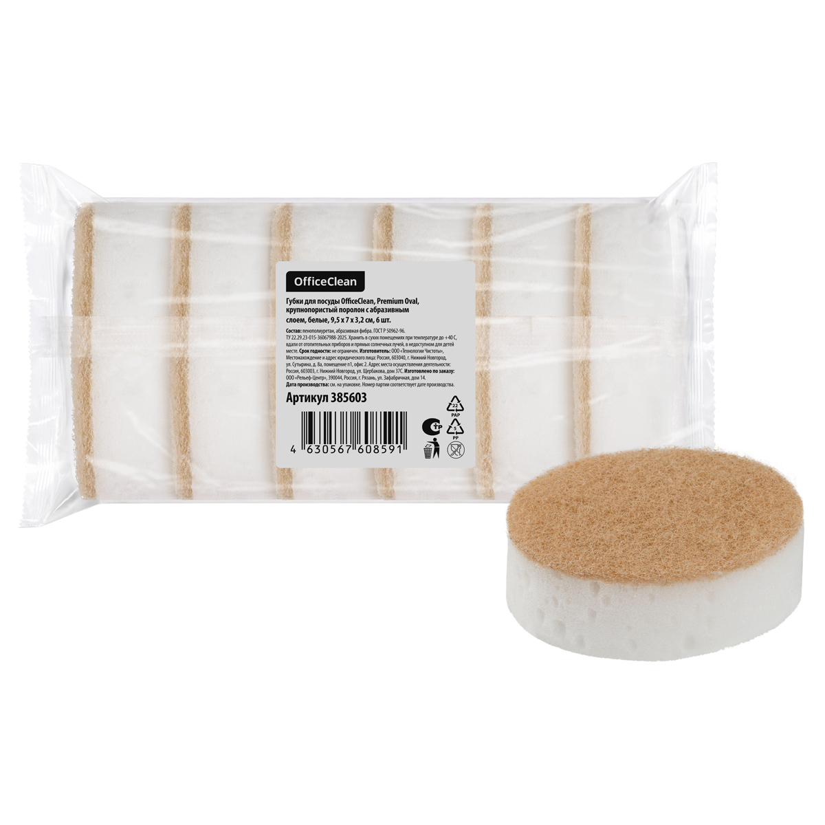Губки для посуды OfficeClean, Premium Oval, крупнопористый поролон с абразивным слоем, белые, 9,5*7*3,2см, 6шт