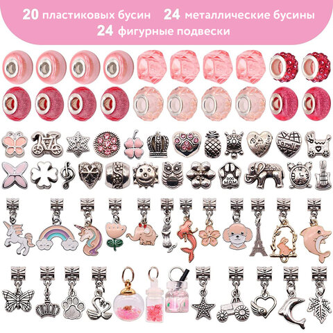 В ПРЕМИУМ НАБОР входят 78 элементов: 20 пластиковых бусины различных цветов, 24 металлических шарма разных размеров, 24 металлических подвески, 5 металлических заготовок для изготовления браслетов, 5 основ для ожерелий.