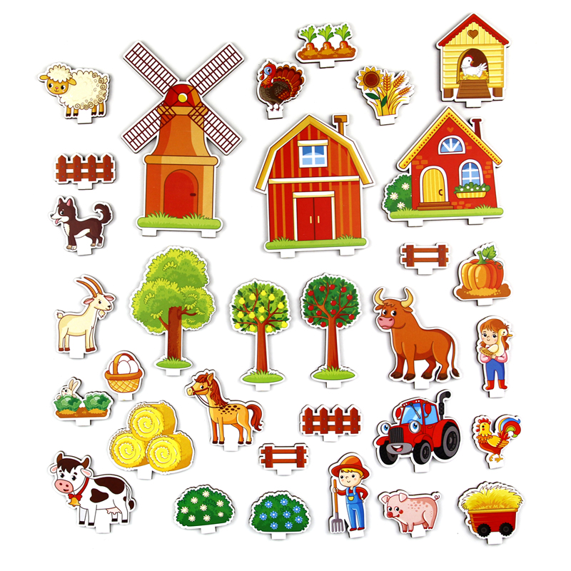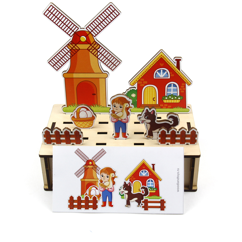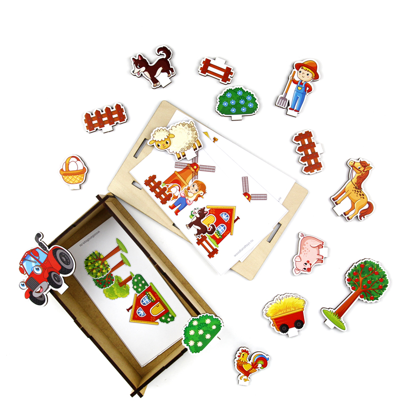 Панорама «Ферма» - это переход от плоскости к объемному восприятию ребенка. Игра – тренажер для моторики рук, задача вставить фигурку под прямым углом. Непоседы научатся концентрироваться, ориентироваться в пространстве, разовьют глазомер и обогатят словарный запас. С помощью карточек-схем ребенок создаст картину, разовьет сюжет, составит короткий рассказ по теме.
