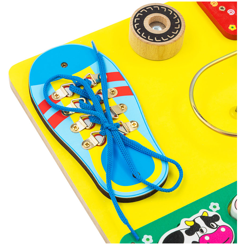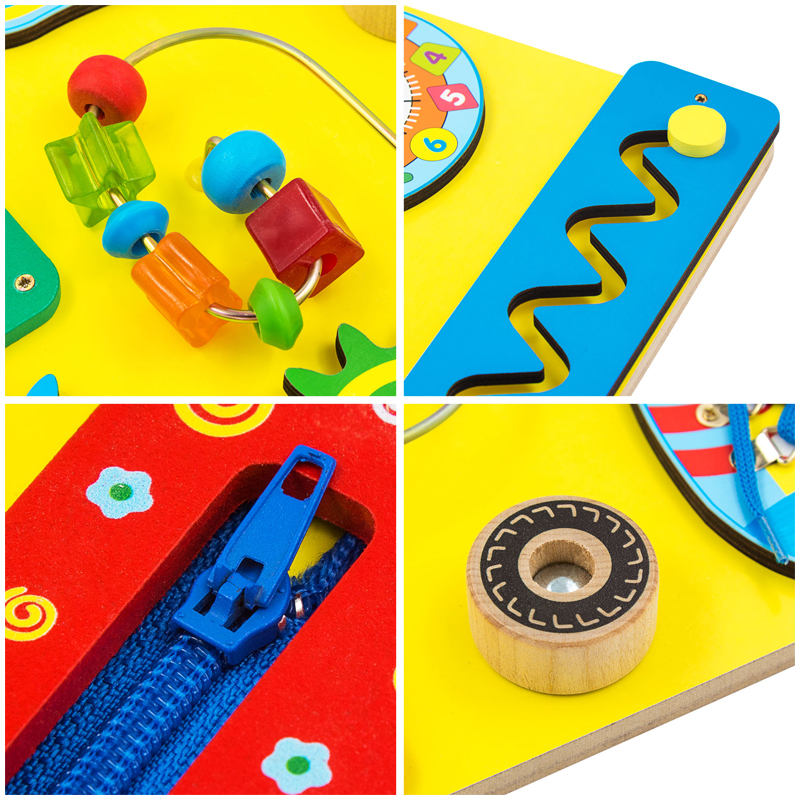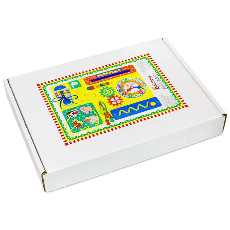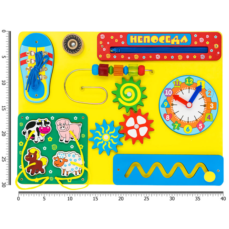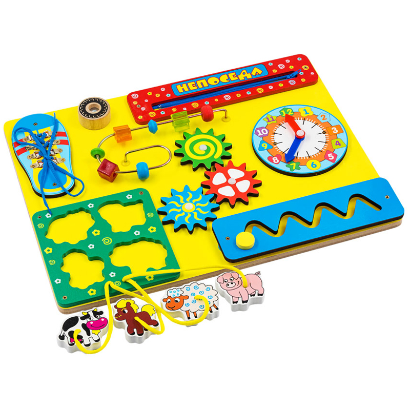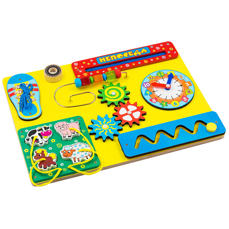 Бизиборд - это игровая доска, созданная по методике Монтессори, для развития основных навыков ребёнка: мелкой моторики, воображения, логики и речи. Бизиборд "Непоседа" - это яркая, познавательная игрушка с интересным наполнением: шестеренки, шнуровка, циферблат часов, молния, радужные детали на проволочке, сортер на шнуровке, лабиринт.