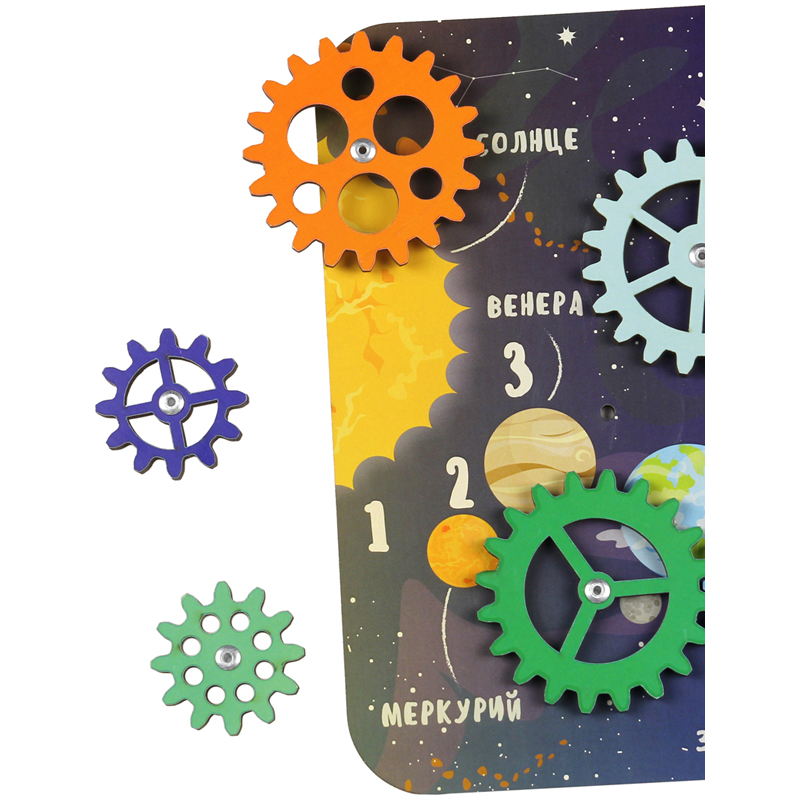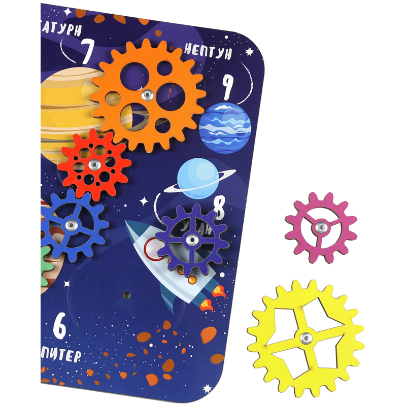 Шестеренки «Космос» представляют собой деревянную доску с изображением планет в космическом пространстве и 10 съёмных шестеренок разного размера и цвета. Задача ребенка собрать из шестеренок подвижную цепь. Правильность выполнения задания подсказывают тематические изображения. Действия с шестеренками развивают логическое мышление, внимание, мелкую моторику. Игра с конструктором «Шестеренки» занимает ребенка на продолжительное время и помогает развитию творческих способностей, зрительного и тактильного восприятия, формирует познавательную активность, усидчивость, любознательность. Шестеренки «Космос» подарят массу положительных эмоций мальчикам и девочкам любого возраста.