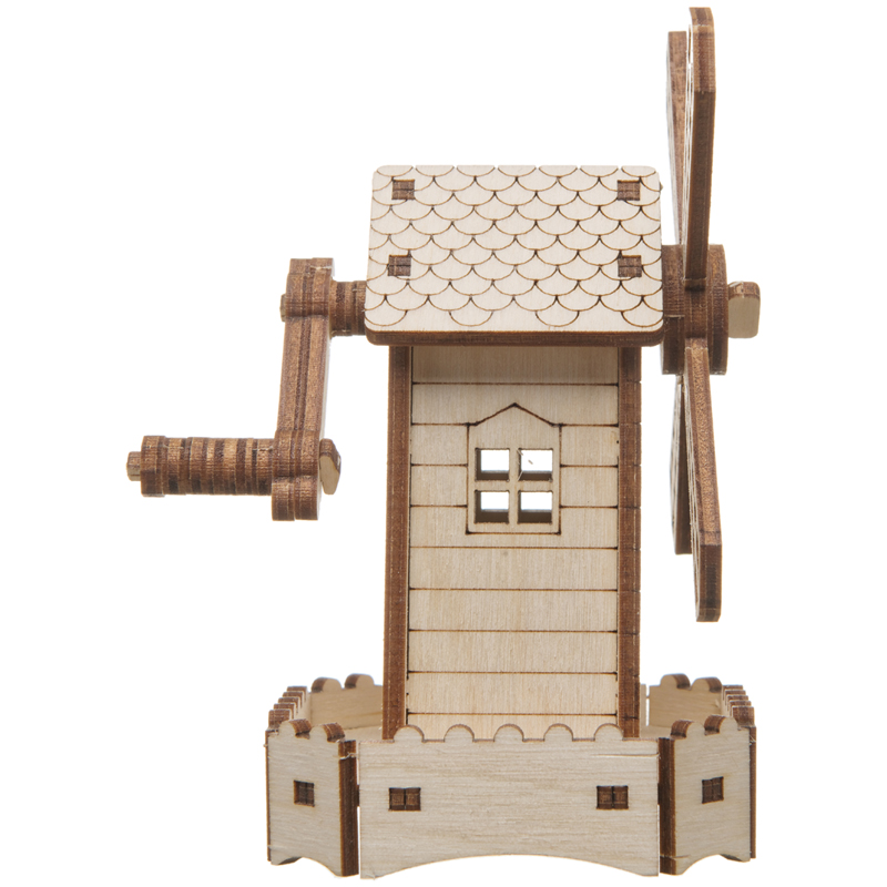 Конструктор 3D деревянный, подвижный "Мельница" бежевого цвета марки TADIWOOD. Модель "Мельница" создана по мотивам народных сказок, с задней части конструктора имеется ручка для вращения крыльев мельницы.