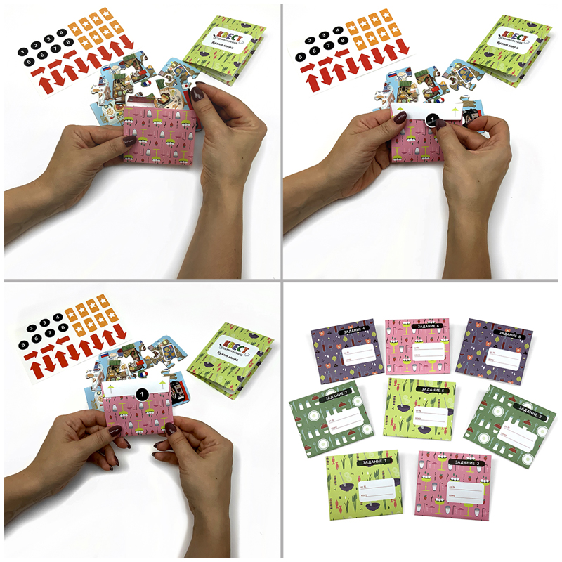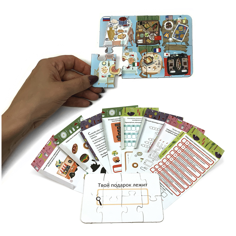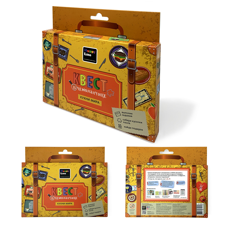 Самое интересное и ожидаемое в любом празднике – это подарок. А что, если не просто вручить подарок, а сделать из этого настоящее приключение с шифрами, загадками, поиском подсказок? С набором «Квест в чемоданчике» это не только увлекательно, но еще и просто! <br/> Для всех маленьких гурманов и любителей путешествий - Квест в чемоданчике «Кухни мира».<br/>Прежде, чем удастся найти свой подарок, придется угадать блюда разных стран, вспомнить названия напитков, познакомиться с дешифратором и выполнить еще ряд увлекательных заданий. <br/> В наборе:<br/> • Инструкция<br/> • Вводная карточка<br/> • 8 писем-конвертиков с интересными заданиями. <br/> • Тематический пазл из 8 элементов, с обратной стороны которого нужно вписать то заветное место, где спрятан подарок. <br/> • А также наклейки для конвертиков и для подсказок. <br/> Для подготовки квеста понадобится всего 15 минут.В каждое письмо-конвертик нужно вложить один элемент пазла. Спрятать конвертики в места согласно инструкции. <br/>Для подсказок можно также использовать наклейки стрелочки и звездочки. <br/> Рекомендовано детям от 5 до 12 лет