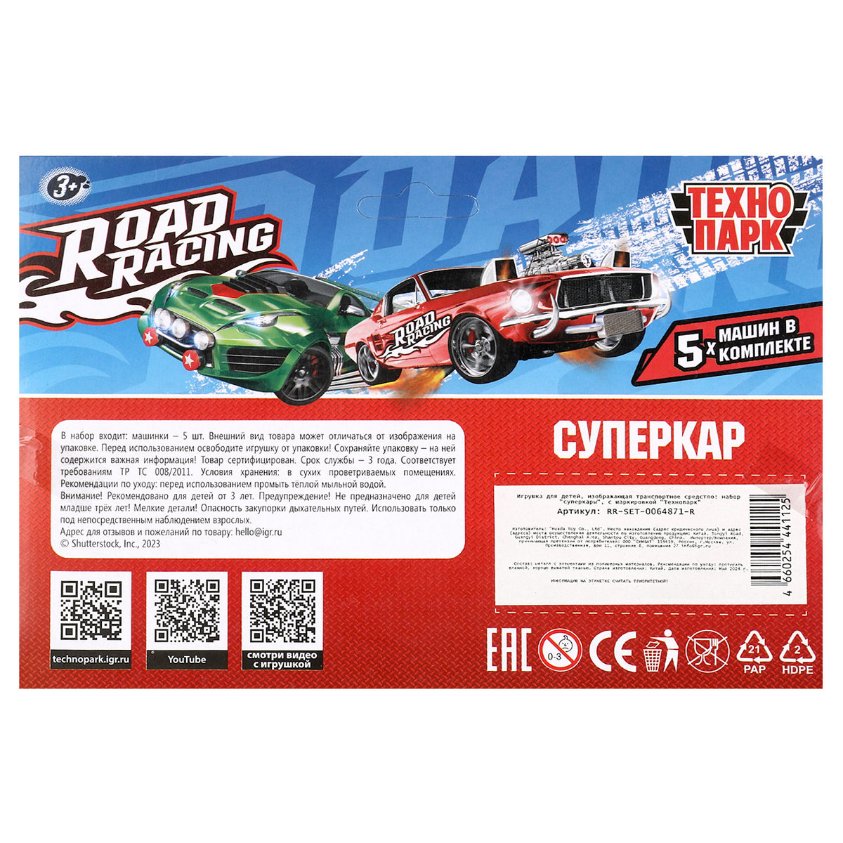 "Набор металлических машинок «Road Racing. Суперкар» ТМ «Технопарк» - прекрасный подарок для маленького автолюбителя:<br/>- 5 моделей в наборе<br/>- прочный металлический корпус<br/>- яркие цвета<br/>- свободный ход колёс<br/><br/>Этот набор крутых машинок обязательно понравится вашему ребёнку. С ними можно придумать множество интересных игровых сюжетов на гоночную тематику.<br/><br/>Игра с машинками ТМ «Технопарк» развивает:<br/>- координацию движений<br/>- внимание<br/>- ловкость<br/>- фантазию и воображение<br/><br/>Длина модели: 7,5см. Материал: металл + пластмасса.<br/>Представлено в ассортименте.<br/>Рекомендовано детям от 3-х лет."