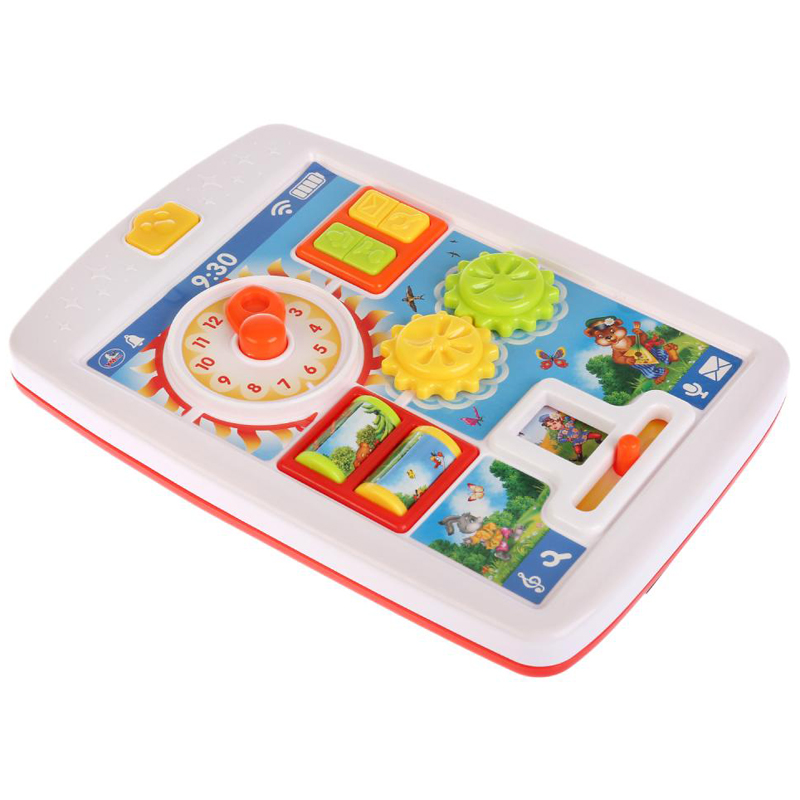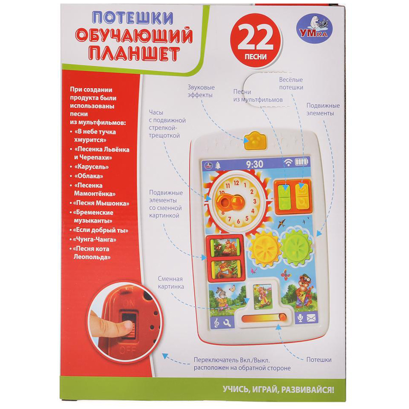 Обучающий планшет. 22 потешки и песни из м/ф. На батарейках. Обучающий планшет "22 потешки и песни из мультфильмов" станет оригинальным подарком. Он выполнен из прочного пластика в ярких цветах. На передней стороне есть различные объёмные и подвижные элементы с разными функциями: 12 потешек; 10 песен из мультфильмов; трещотка и другие элементы - часы; звуковые эффекты. Нажимая их, ребёнок выучит формы и цвета, потешки и песни. Игрушка развивает зрение, память, слух, мелкую моторику. Рекомендуется детям от 1 года.