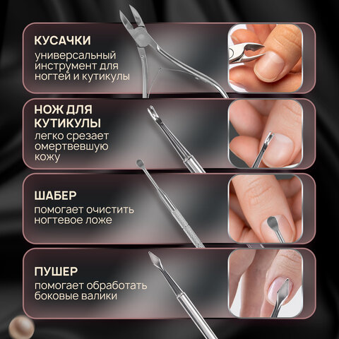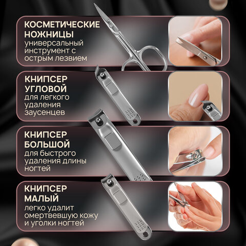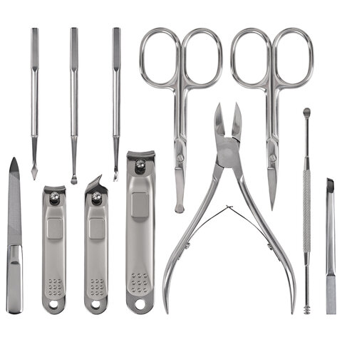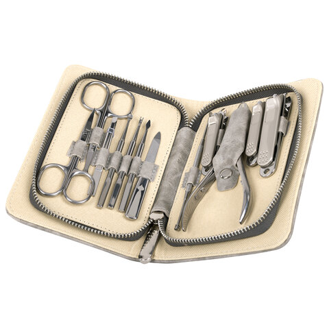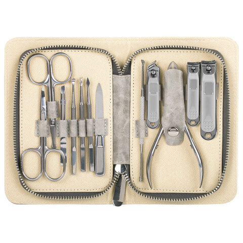Премиальный маникюрный набор из 12 предметов идеально подходит для комплексного домашнего и профессионального ухода. Инструменты изготовлены из нержавеющей стали и цинкового сплава.