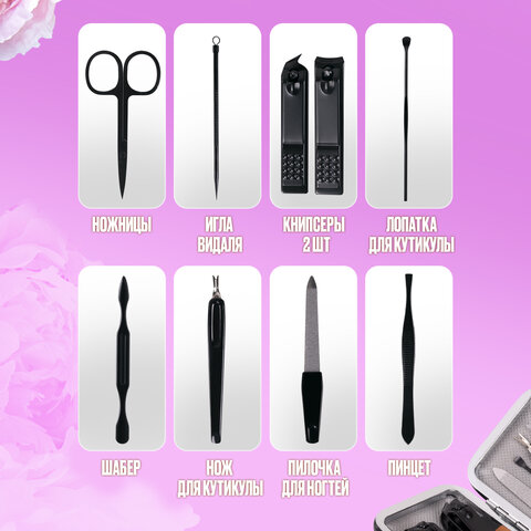 Многофункциональный маникюрный набор из 9 предметов идеально подходит для комплексного домашнего и профессионального ухода. Лезвия изготовлены из нержавеющей стали. Маникюрный набор включает в себя инструменты для маникюра, педикюра и ухода за лицом. Маникюрные инструменты упакованы в стильный компактный футляр. Он легко помещается в любую сумочку и не занимает место во время путешествия. Конструкция кейса защищает содержимое от повреждений. Вы получаете возможность сделать маникюр своими руками, радуя красотой себя и своих близких. Всё это у вас получится сделать прямо у себя дома. Набор продается в подарочной упаковке, что делает его отличным подарком на любой праздник. Перед применением необходимо продезинфицировать инструменты. Храните в сухом месте. Не подвергайте воздействию кислот и щелочей.