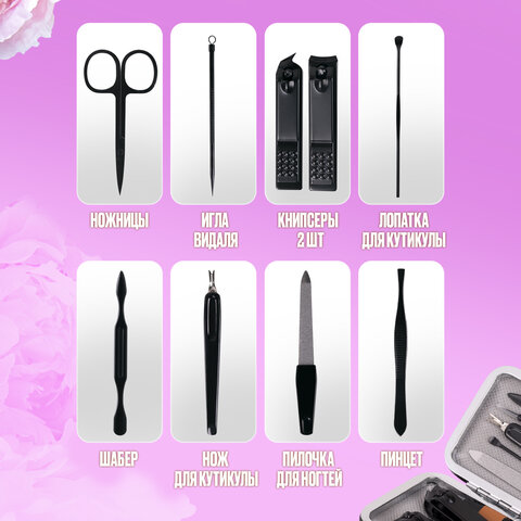 Многофункциональный маникюрный набор из 9 предметов идеально подходит для комплексного домашнего и профессионального ухода. Лезвия изготовлены из нержавеющей стали. Маникюрный набор включает в себя инструменты для маникюра, педикюра и ухода за лицом. Маникюрные инструменты упакованы в стильный компактный футляр. Он легко помещается в любую сумочку и не занимает место во время путешествия. Конструкция кейса защищает содержимое от повреждений. Вы получаете возможность сделать маникюр своими руками, радуя красотой себя и своих близких. Всё это у вас получится сделать прямо у себя дома. Набор продается в подарочной упаковке, что делает его отличным подарком на любой праздник. Перед применением необходимо продезинфицировать инструменты. Храните в сухом месте. Не подвергайте воздействию кислот и щелочей.