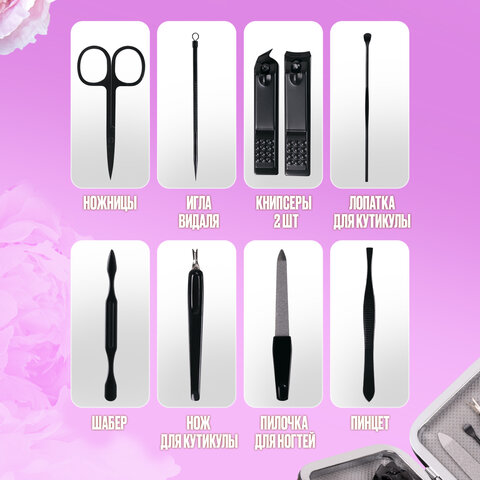 Многофункциональный маникюрный набор из 9 предметов идеально подходит для комплексного домашнего и профессионального ухода. Лезвия изготовлены из нержавеющей стали. Маникюрный набор включает в себя инструменты для маникюра, педикюра и ухода за лицом. Маникюрные инструменты упакованы в стильный компактный футляр. Он легко помещается в любую сумочку и не занимает место во время путешествия. Конструкция кейса защищает содержимое от повреждений. Вы получаете возможность сделать маникюр своими руками, радуя красотой себя и своих близких. Всё это у вас получится сделать прямо у себя дома. Набор продается в подарочной упаковке, что делает его отличным подарком на любой праздник. Перед применением необходимо продезинфицировать инструменты. Храните в сухом месте. Не подвергайте воздействию кислот и щелочей.