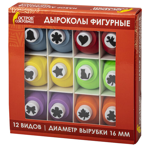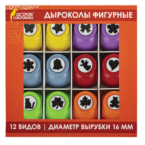 Фигурные дыроколы ОСТРОВ СОКРОВИЩ предназначены для декорирования изделий путем создания четкой и красивой перфорации разной формы. Дырокол компактный и удобный в применении, размер - 32х45х38 мм. Диаметр пробиваемого отверстия - 16 мм, формы вырубки: сердце, звезда, василёк, клевер, кленовый листок, бантик, бабочка, ангел, колокольчик, мишка, кот, цветок. Один дырокол делает одну форму вырубки. В наборе – 12 видов дыроколов разных цветов с разными вырубками.