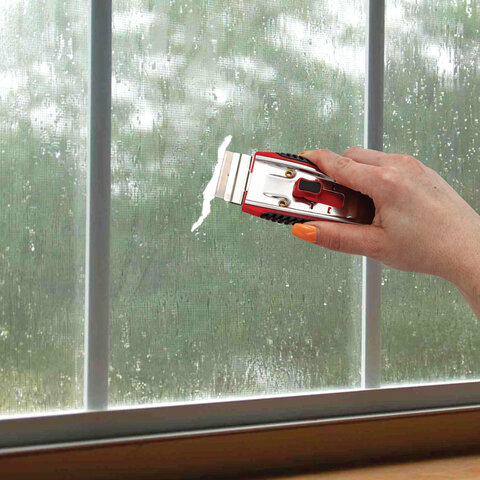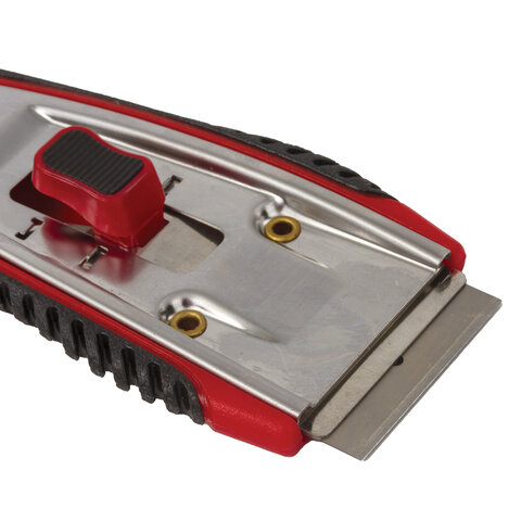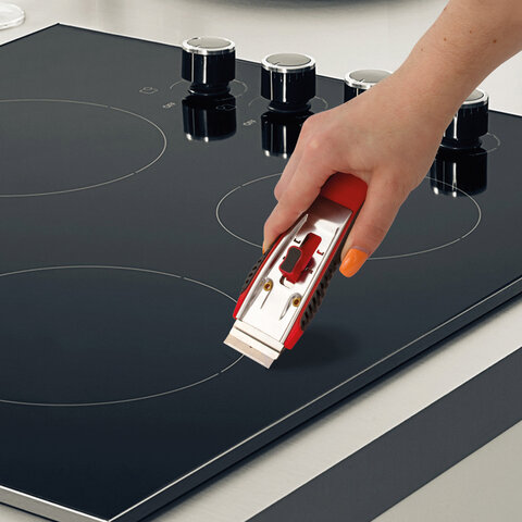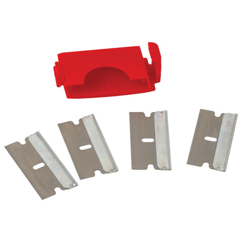 Скребок выполнен из прочного АBS пластика. Прорезиненный корпус препятствуют скольжению в руках и обеспечивает удобство в работе. 5 лезвий из стали в комплекте! 1 расположено в держателе, 4 - в специальном отделении корпуса изделия. Ширина лезвия - 39 мм, длина лезвия - 20 мм. Это идеальный помощник для бережного и эффективного удаления с плоских и гладких поверхностей (стекло, плитка, керамические плиты, ламинат и ламинированные поверхности) свежих или застарелых загрязнений от жира, смолы, жевательной резинки, битума или краски.