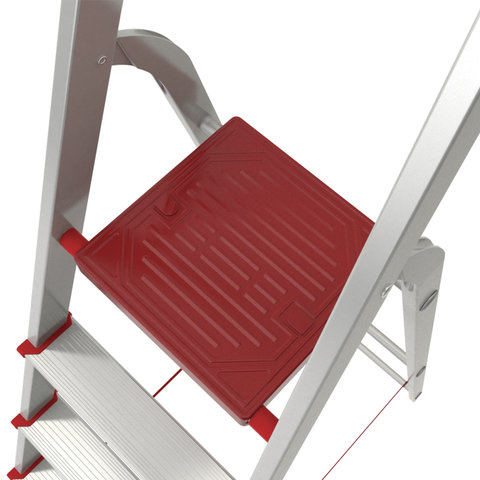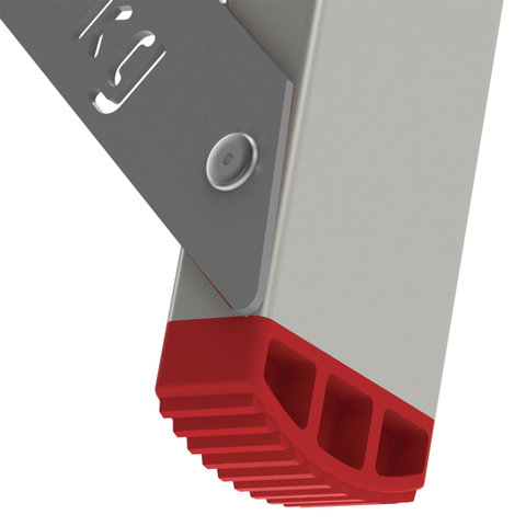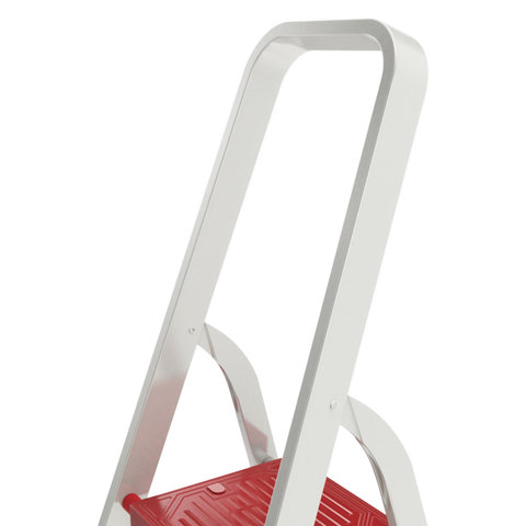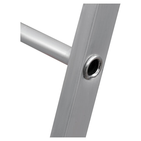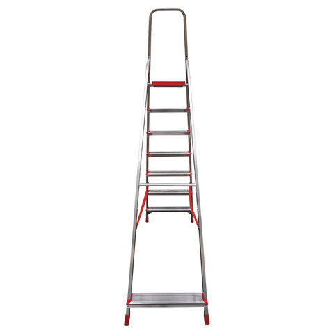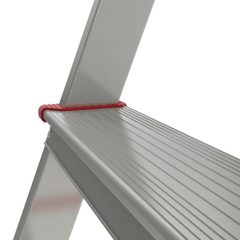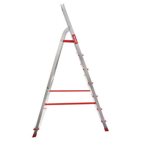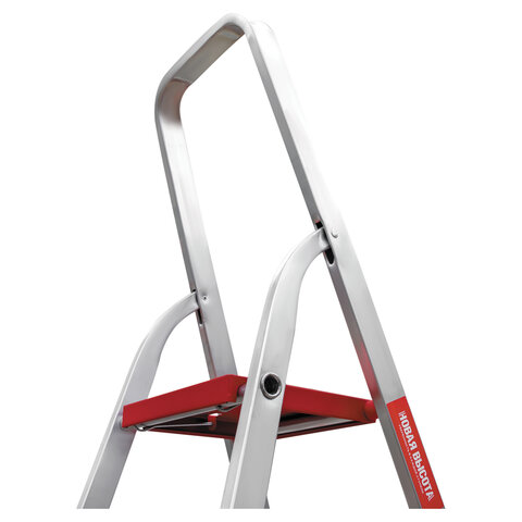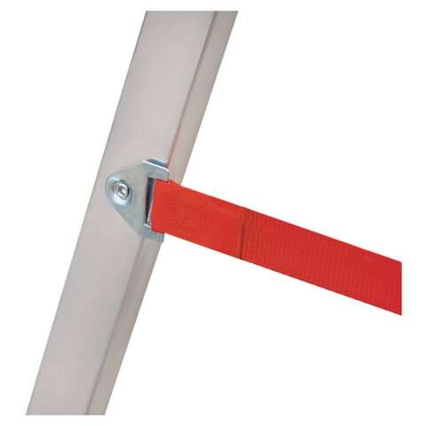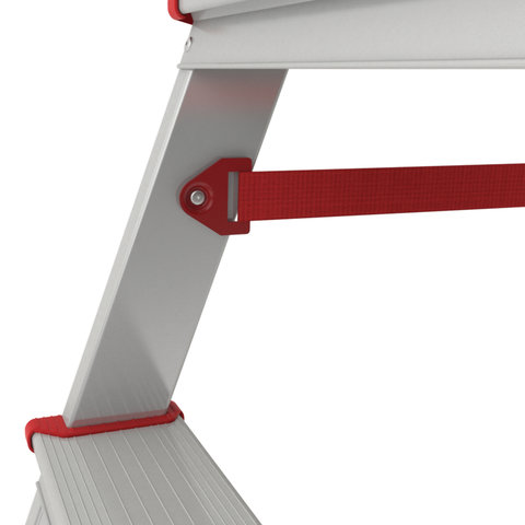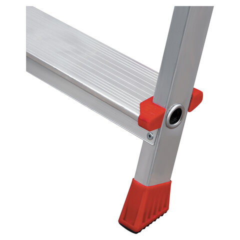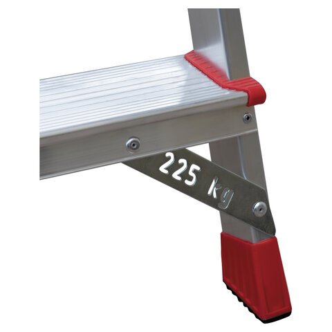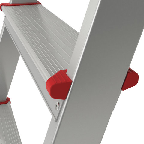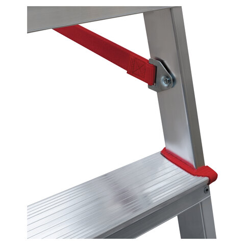 Рифлёная поверхность ступеней способствует безопасному подъёму и спуску, а прочное крепление ступеней к боковинам 6 заклёпками придаёт конструкции высокую устойчивость. Опорные наконечники из прочного пластика обеспечивают устойчивое положение. Лестница располагает дугой безопасности 600 мм и прочными страховочными ремнями.