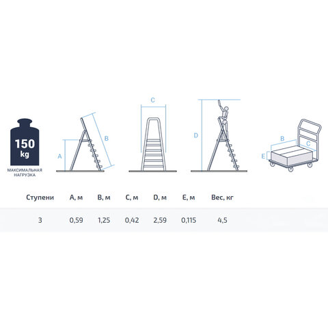 Стремянка стальная 3 ступени, нагрузка до 120кг, вес 3,7кг