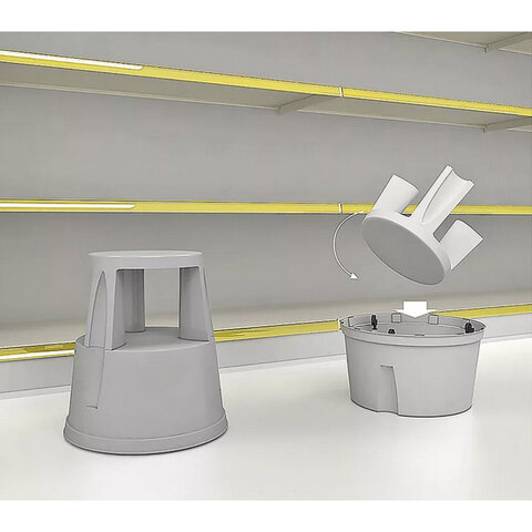 Стремянка-табурет идеальна в торговой сфере, на складе, архиве, библиотеке. За счет платформы на трех колесиках, которые находятся на мини амортизаторах она легко катается, а при нагрузке плотно прижимается к полу и становится более устойчивой.