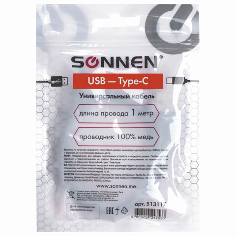 Type-C USB дата-кабель SONNEN предназначен для зарядки, передачи данных и синхронизации портативных устройств с разъемом Type-C.