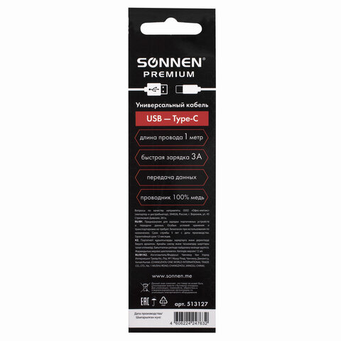 Кабель USB 2.0-Type-C, 1 м, SONNEN, медь, для передачи данных и зарядки, черный, 513117