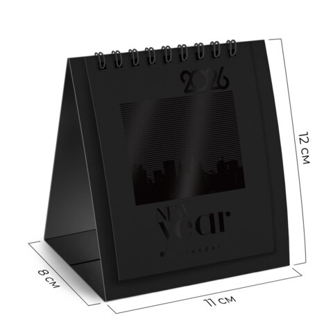 12 листов календарной сетки на офсетной бумаге плотностью 80 г/м2 в 2 краски. Основа изготовлена из импортного картона плотностью 300 г/м2, крашенный с 2-х сторон. Стильная монохромная обложка с дизайном, выполненным УФ-лаком. Размер – 11х12 см. Поставляется в индивидуальной упаковке (пакет с липким краем).