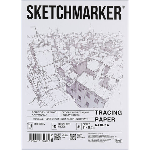 Калька SKETCHMARKER изготавливается из высококачественного сырья, обладает высокой прочностью, но при этом почти прозрачна. Калька предназначена для рисования и черчения карандашами, ручками и чернилами. Подходит для печати на струйном и лазерном принтере