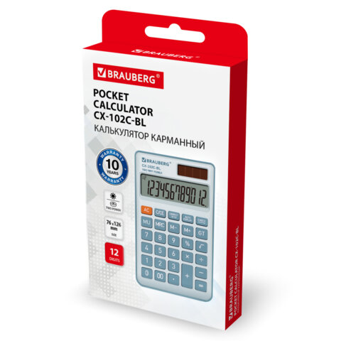 Калькулятор карманный BRAUBERG CX-102C-BU (76x126мм), 12 разрядов, двойное питание, СИНИЙ, 272648
