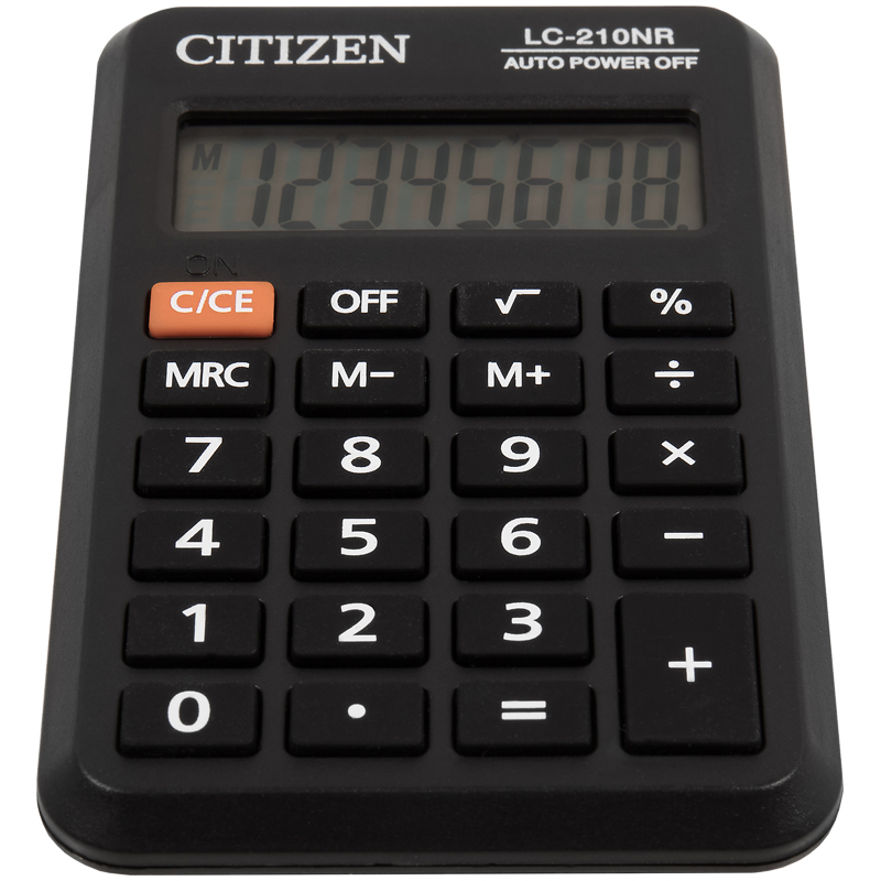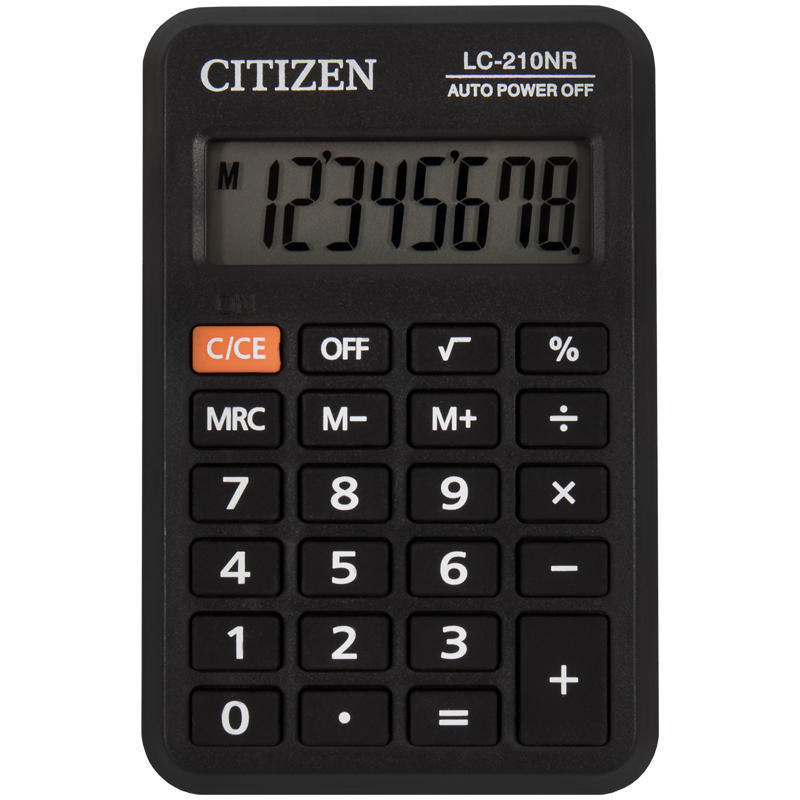 8-ми разрядный карманный калькулятор Citizen LC-210NR предназначен для выполнения арифметических операций. Базовые функции помогут сделать простые расчёты, вычислить квадратный корень и проценты, выполнить операции с памятью. Калькулятор работает только на батарейке AG10(LR1130), кнопка выключения позволит сэкономить заряд. Упакован в картонную коробку. Размер калькулятора – 64*98*12 мм, вес – 40 г, цвет – чёрный. Гарантия 5 лет. Карманные калькуляторы идеально подойдут взрослым и детям, они компактны и надежны.<br/>• Разрядность: 8;<br/>• Тип питания: батарейка AG10(LR1130); <br/>• Квадратный корень;<br/>• Подходит для ЕГЭ.