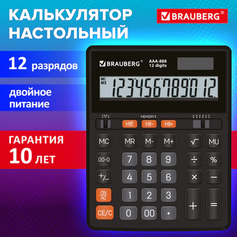 Настольный калькулятор BRAUBERG AAA-888. Большой дисплей с увеличенными символами, надежный корпус и оптимальный набор наиболее используемых функций для эффективной работы.