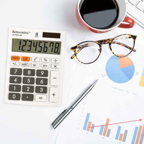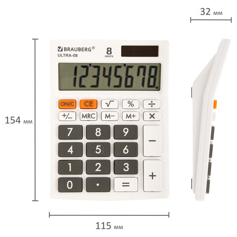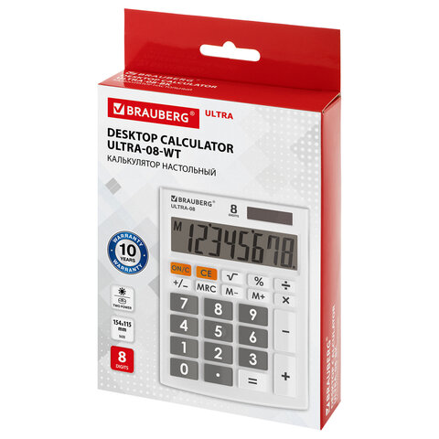 Настольный калькулятор BRAUBERG ULTRA-08-WT. Большой яркий дисплей, устойчивый корпус с прорезиненными ножками и крупная клавиатура с цветной дифференциацией позволяют работать эффективнее с максимальным комфортом.